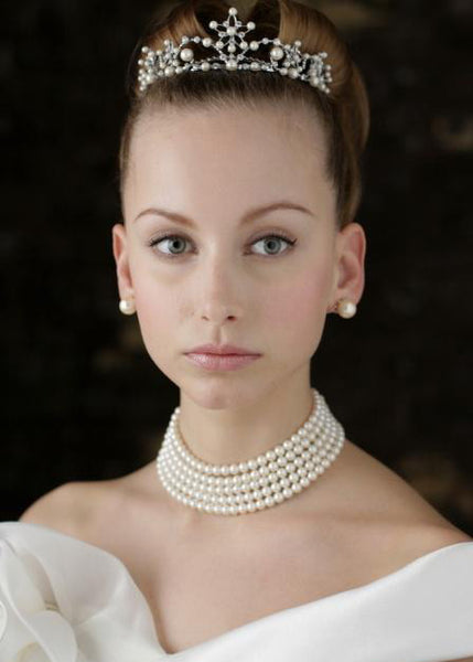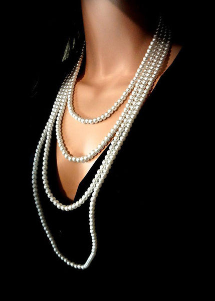 The Bib Necklace. It consists of several rows of pearl strands of different lengths. You may have several necklaces of different lengths, potentially with diverse sizes of pearls as well, to create this impression.