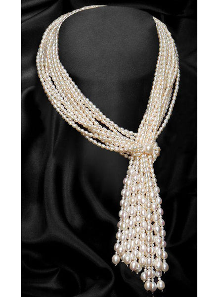 The Opera Necklace is a dropdown string of pearls. The length of the necklace is between 75cm and 90cm. Ropes are also knotted or doubled/tripled in order to fit the style of a lady’s dress.